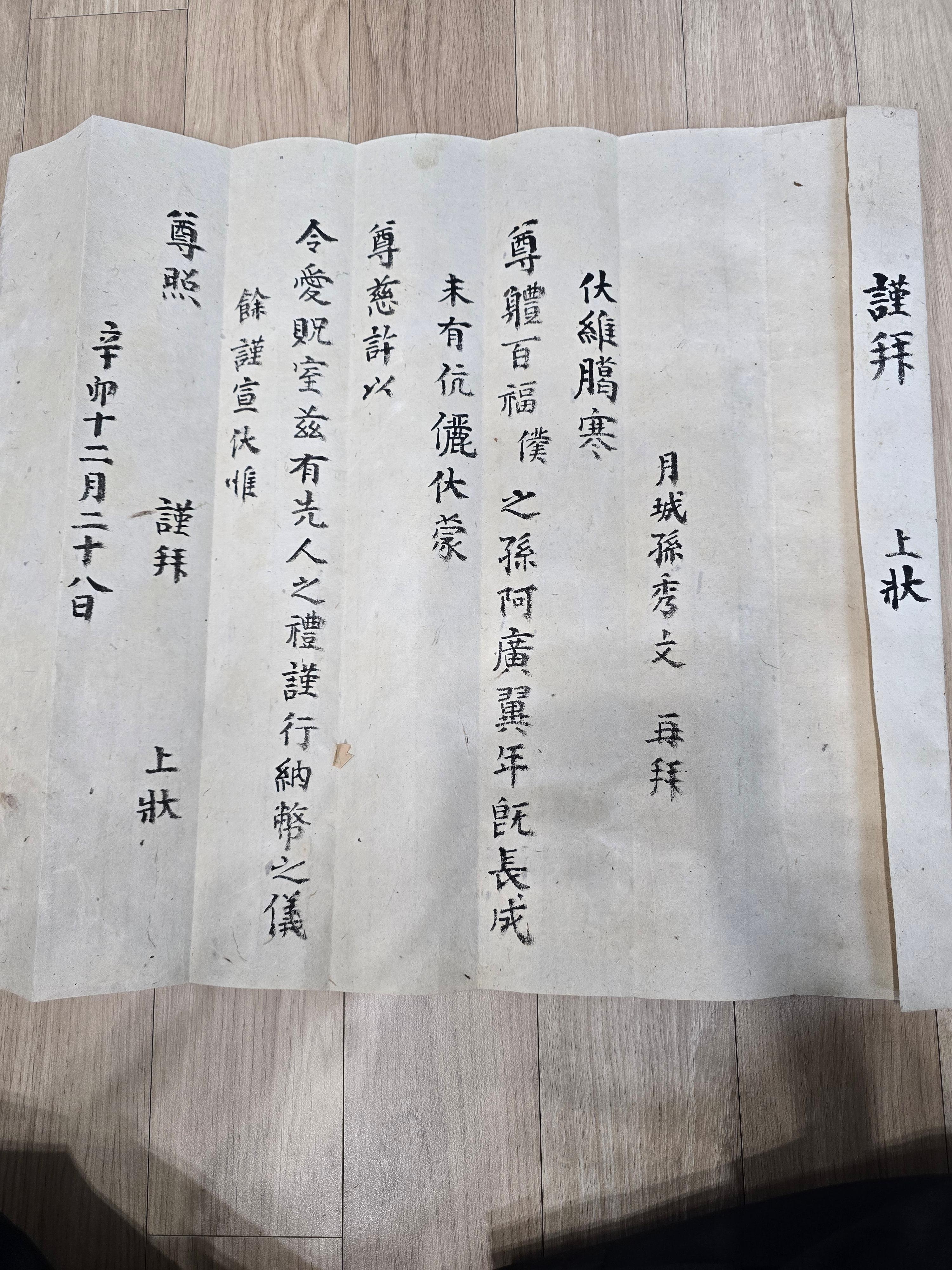 月城孫秀文再拜,伏維臘寒,尊體百福。僕之孫阿廣翼,年旣長成,未有伉儷,伏蒙尊慈,許以令愛貺室,玆有先人之禮,謹行納幣之儀,餘謹(不)宣。伏惟尊照.